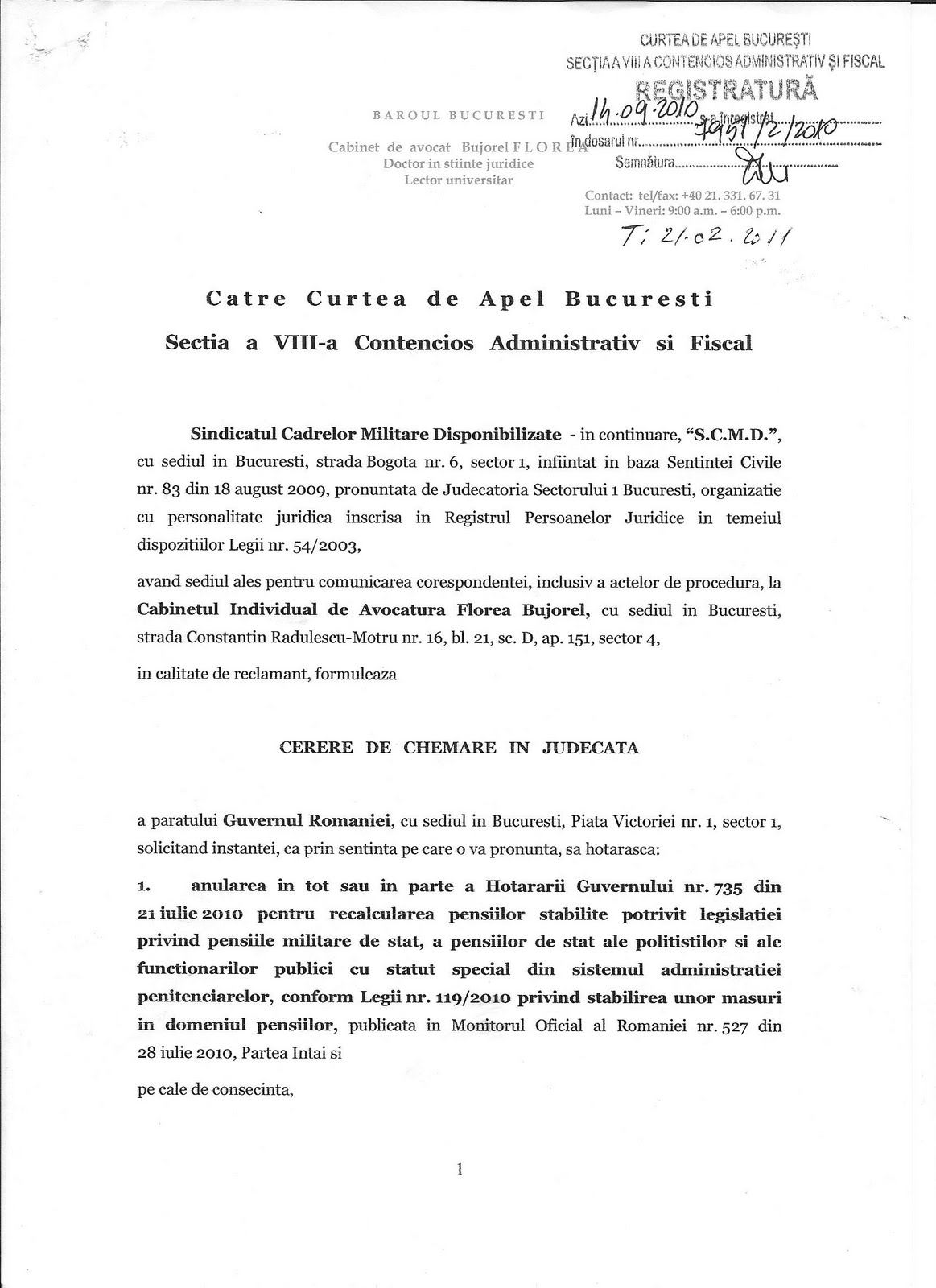 Scmd Departamentul Juridic Cerere De Chemare In Judecata A Guvernului Romaniei In Scopul Suspendarii Executarii Hotararii Guvernului Nr 735 2010 Inregistrata La Curtea De Apel Bucuresti Dosar Nr 7130 2 2010