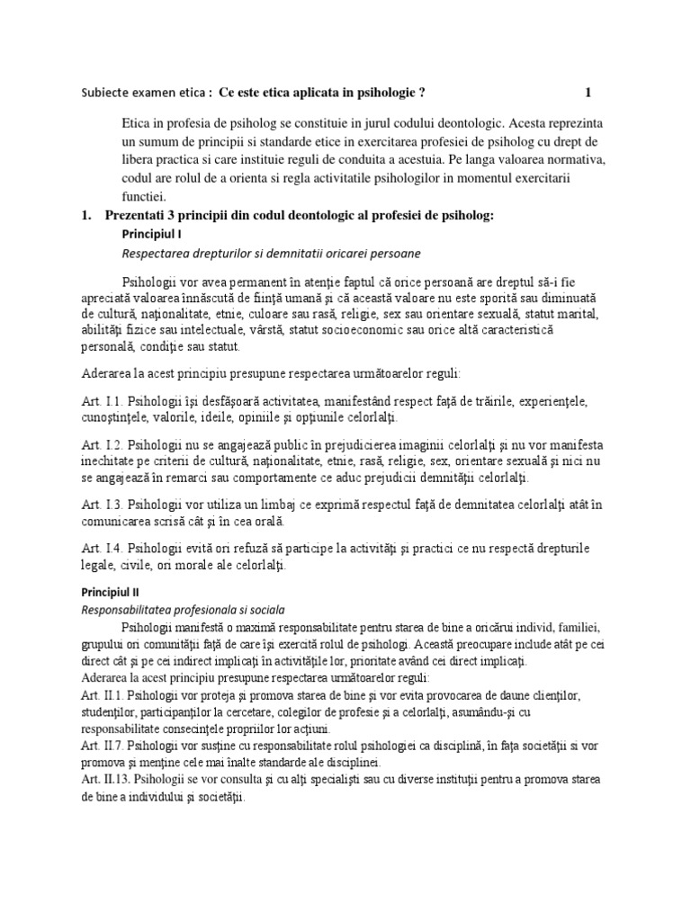 1 Prezentati 3 Principii Din Codul Deontologic Al Profesiei De Psiholog Principiul I