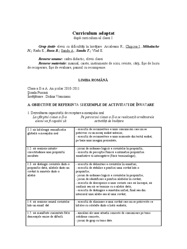 Curriculum Adaptat Pentru Elevi Cu Ces Clasa 2