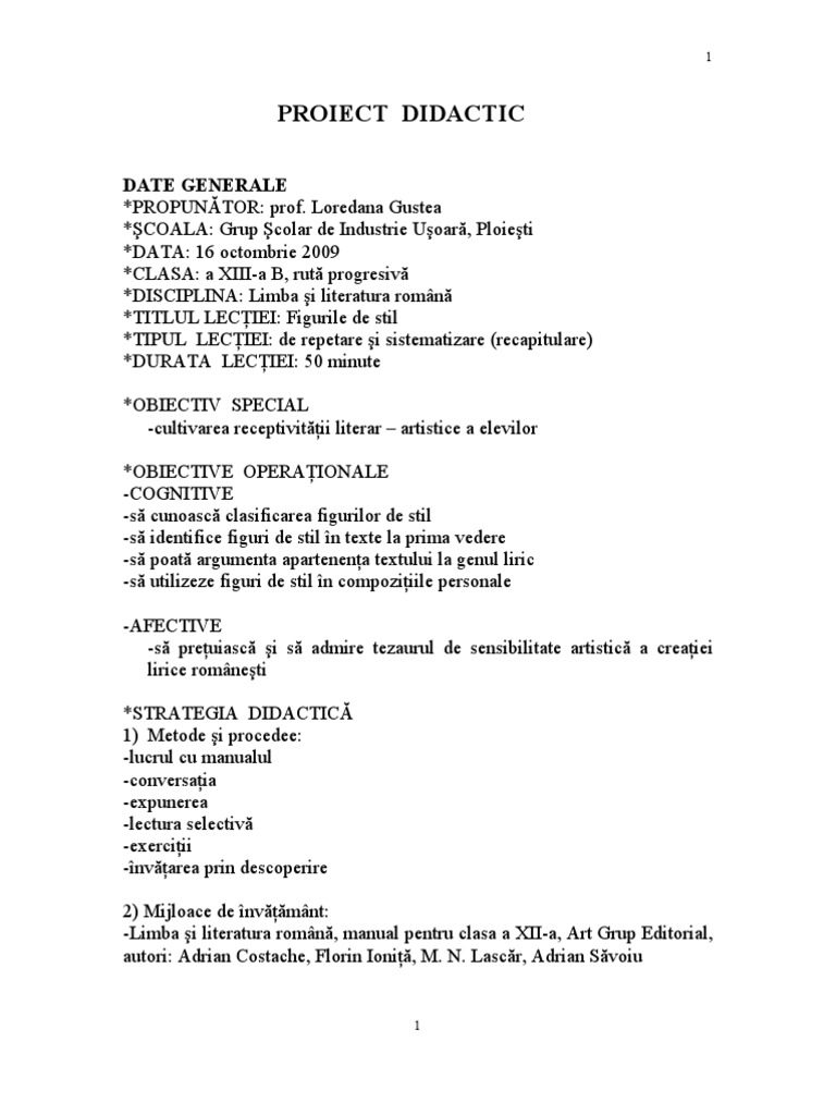 Proiect Proiect De Activitate Didactica Figurile De Stil Pedagogie 304634