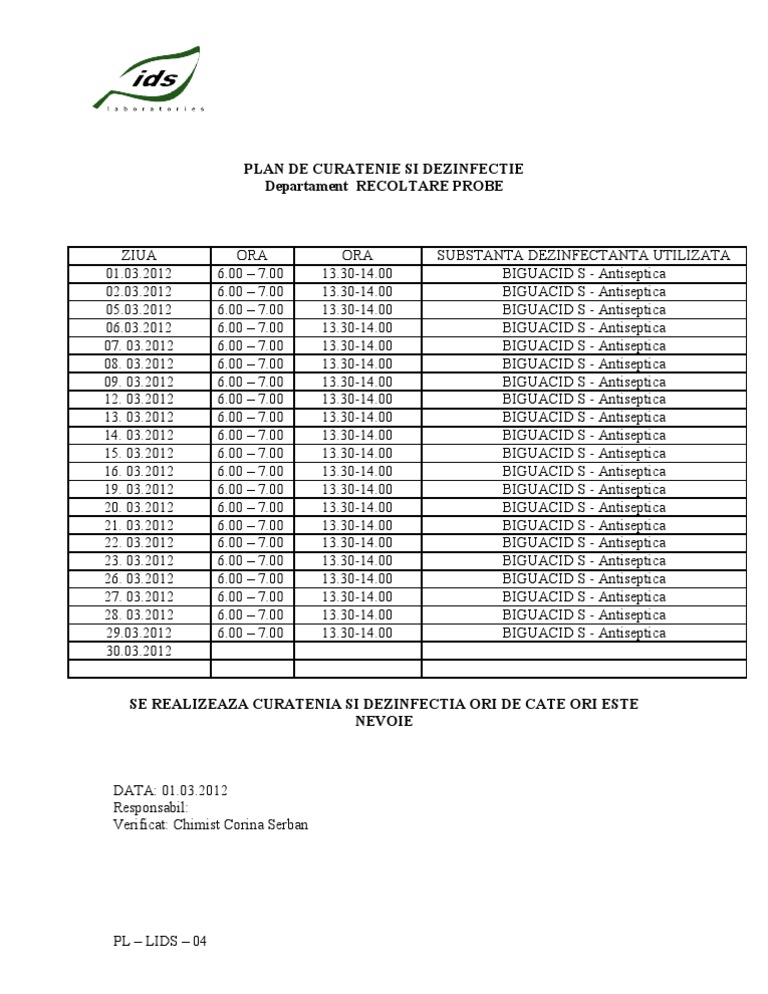 Plan De Curatenie Si Dezinfectie 2011