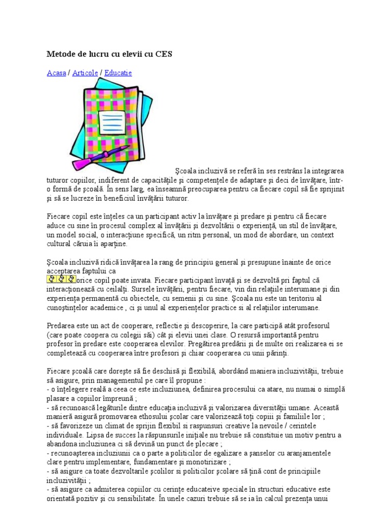 Metode didactice pentru copii cu ces. Metode ş i procedee active ş i incluzive în învăţare şi evaluare în practica educa ţională eforturile cadrelor didactice au fost şi sunt centrate pe aplicarea celor mai recente şi valoroase cercetări din domeniul psihopedagogiei invăţării pentru perfecţionarea continuă a metodelor şi procedeelor didactice prin adaptarea unei noi perspective cu privire la raportul predare. Prima pagină materiale formare educaţie incluzivă strategii de integrare a copiilor cu ces strategii de integrare a copiilor cu ces 11 ianuarie 2012 13 38. A în timp ce clasa lucrează la o activitate profesorul se poate ocupa de unul sau doi copii reluând cu acestia principalele puncte ale lecţiei sau ajutându i să înceapă să rezolve singuri sarcina legată de subiectul lecţiei. învăţat în şcoli speciale cu cadre didactice pregătite pentru a lucra cu astfel de copii dar în ultimii ani s a ajuns la concluzia că procedându se astfel aceşti elevi sunt oarecum excluşi din viaţa socială şi s a decis întegrarea lor în învăţământul de masă.