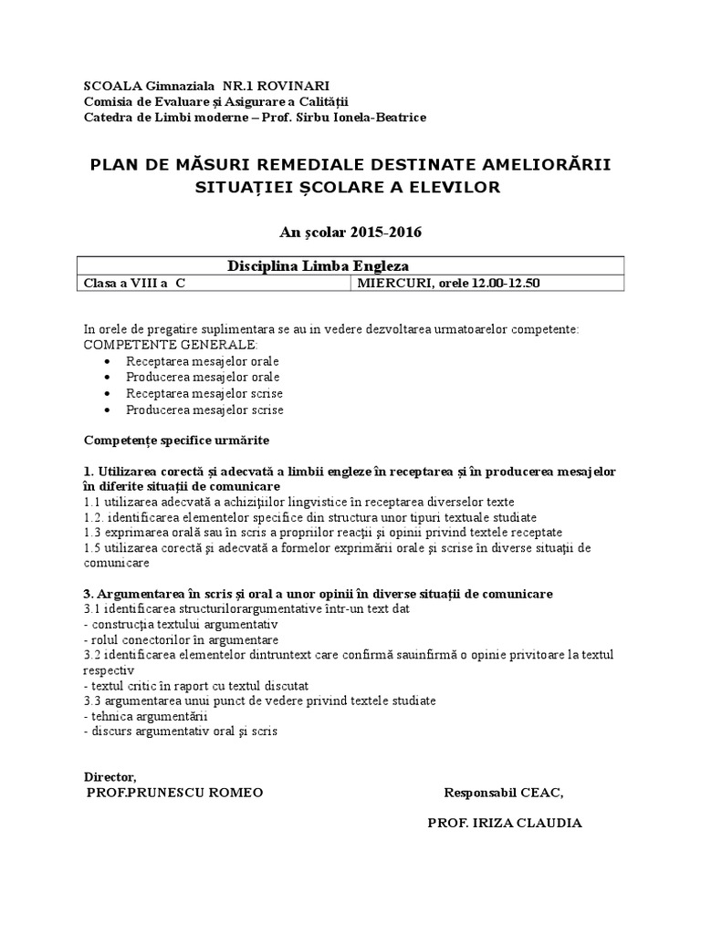 Plan Remedial Personalizat Pentru Elevii Cu Ces Doc