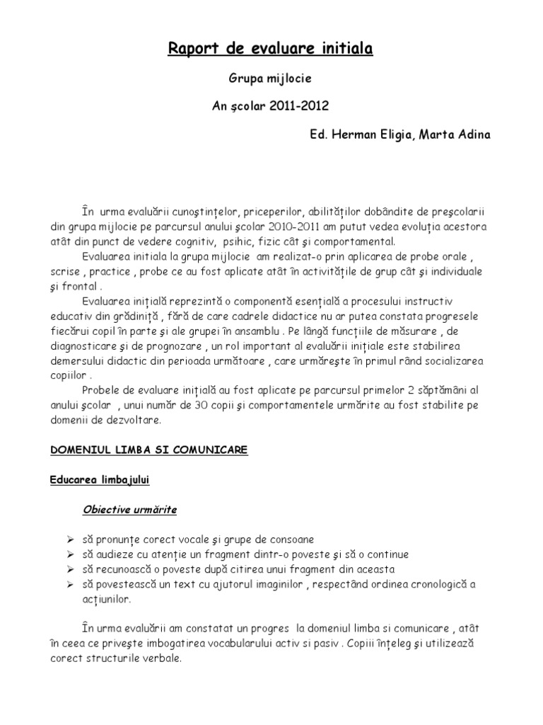 Raport De Evaluare Initiala Grupa Mijlocie