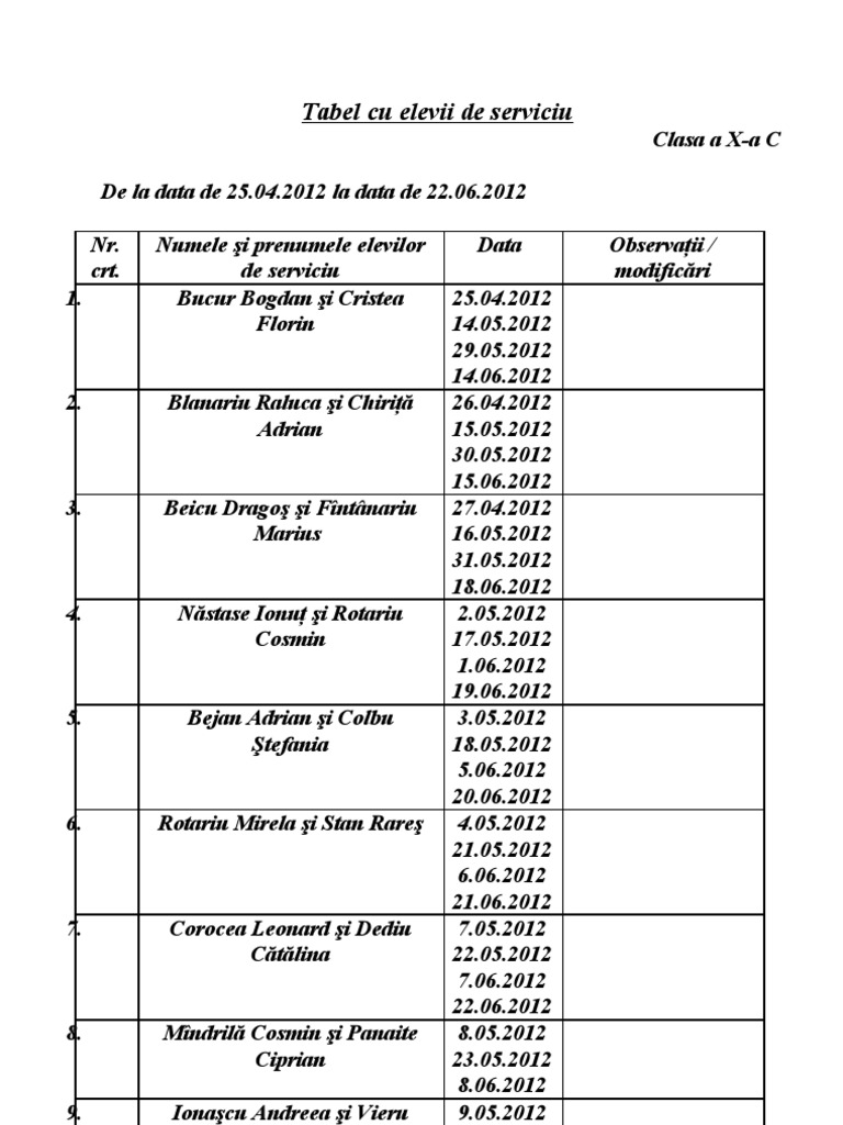 Tabel Elevi De Serviciu Pe Clasa