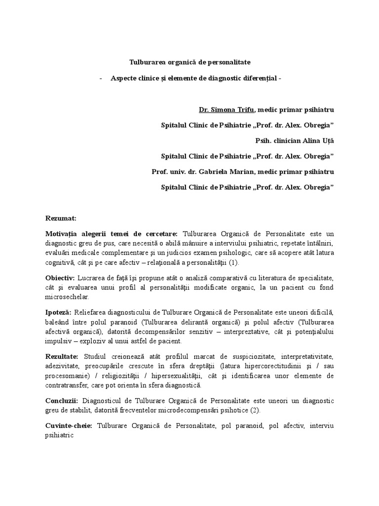 Pdf Tulburarea Organica De Personalitate Aspecte Clinice Si Elemente De Diagnostic Diferential